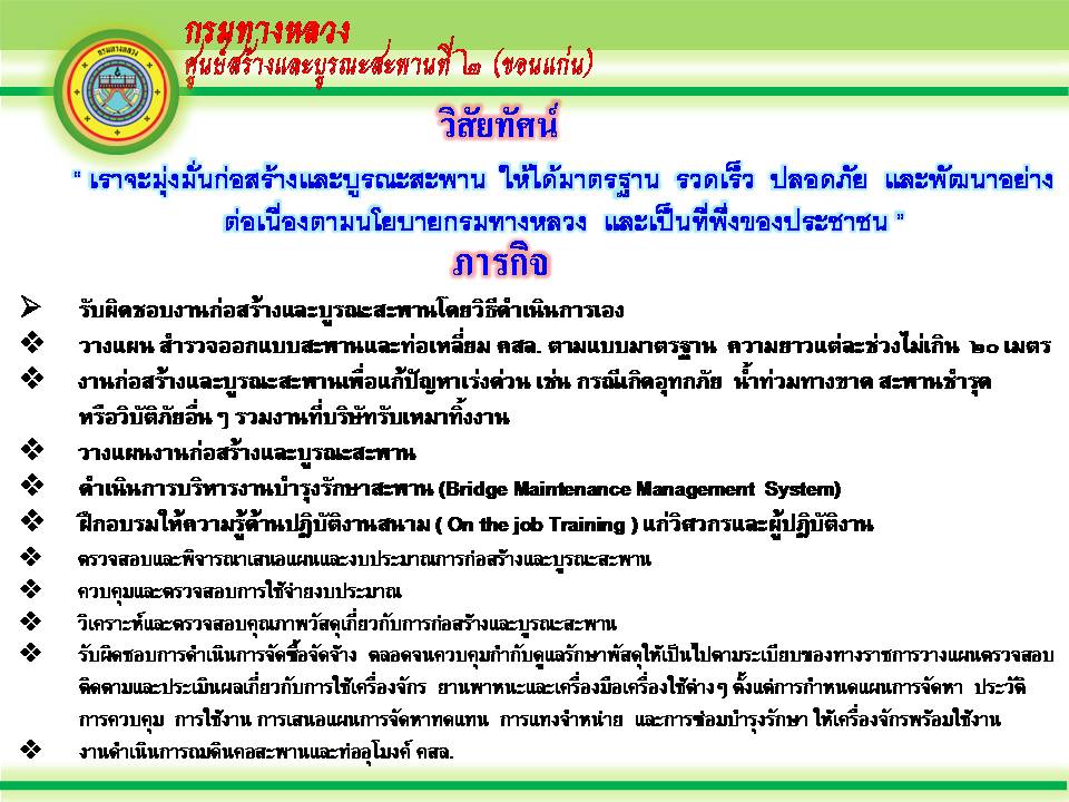 วิสัยทัศน์ : “ งานสะพานที่ มั่นคง ปลอดภัย โปร่งใส ให้ความเป็นมิตรกับสิ่งแวดล้อม และใกล้ชิดประชาชน ”