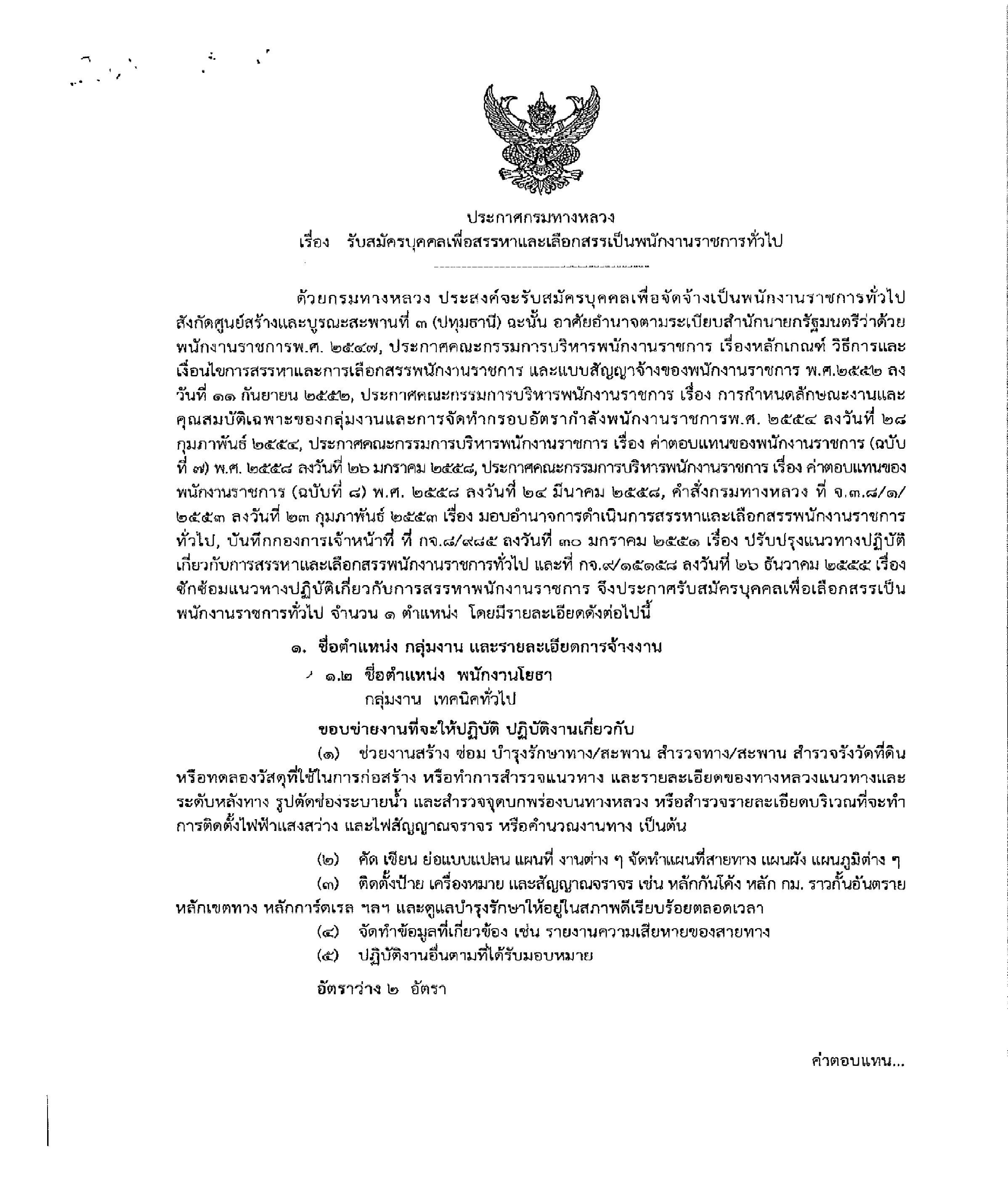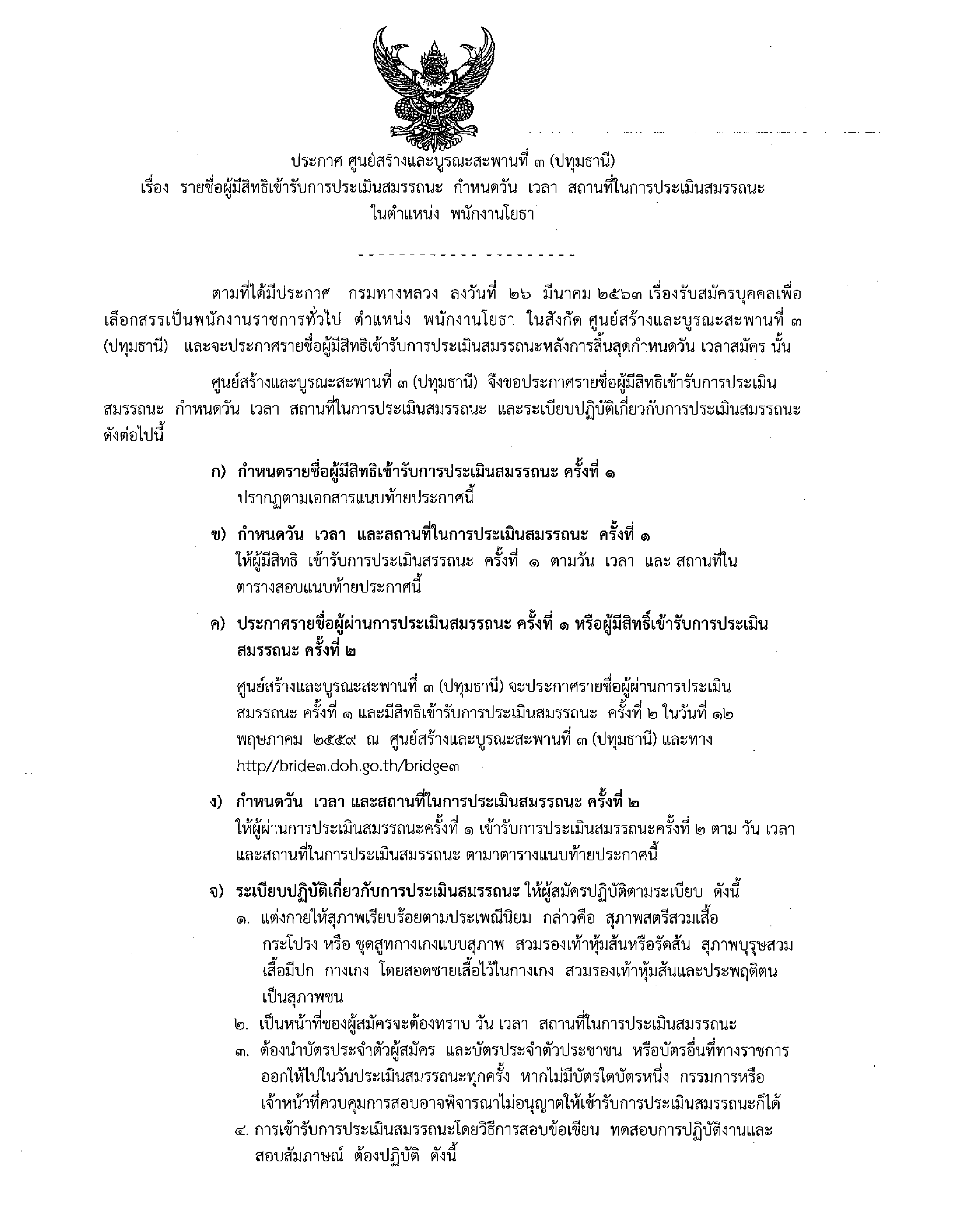 ประกาศรายชื่อผู้มีสิทธิเข้ารับการประเมินสมรรถนะครั้งที่ 1 กำหนดวัน เวลา สถานที่ในการประเมินสมรรถนะครั้งที่ 1 ในตำแหน่ง พนักงานโยธา