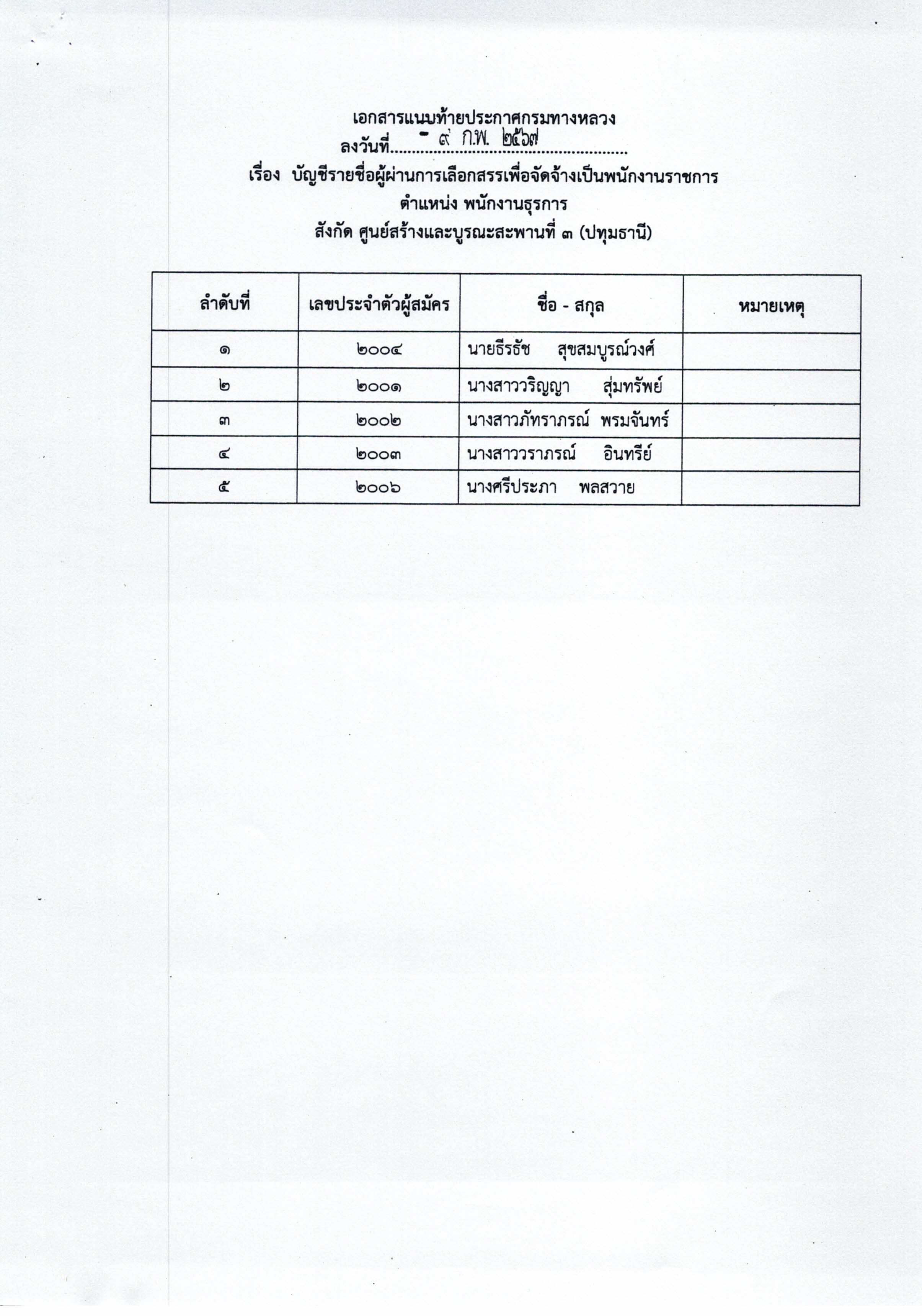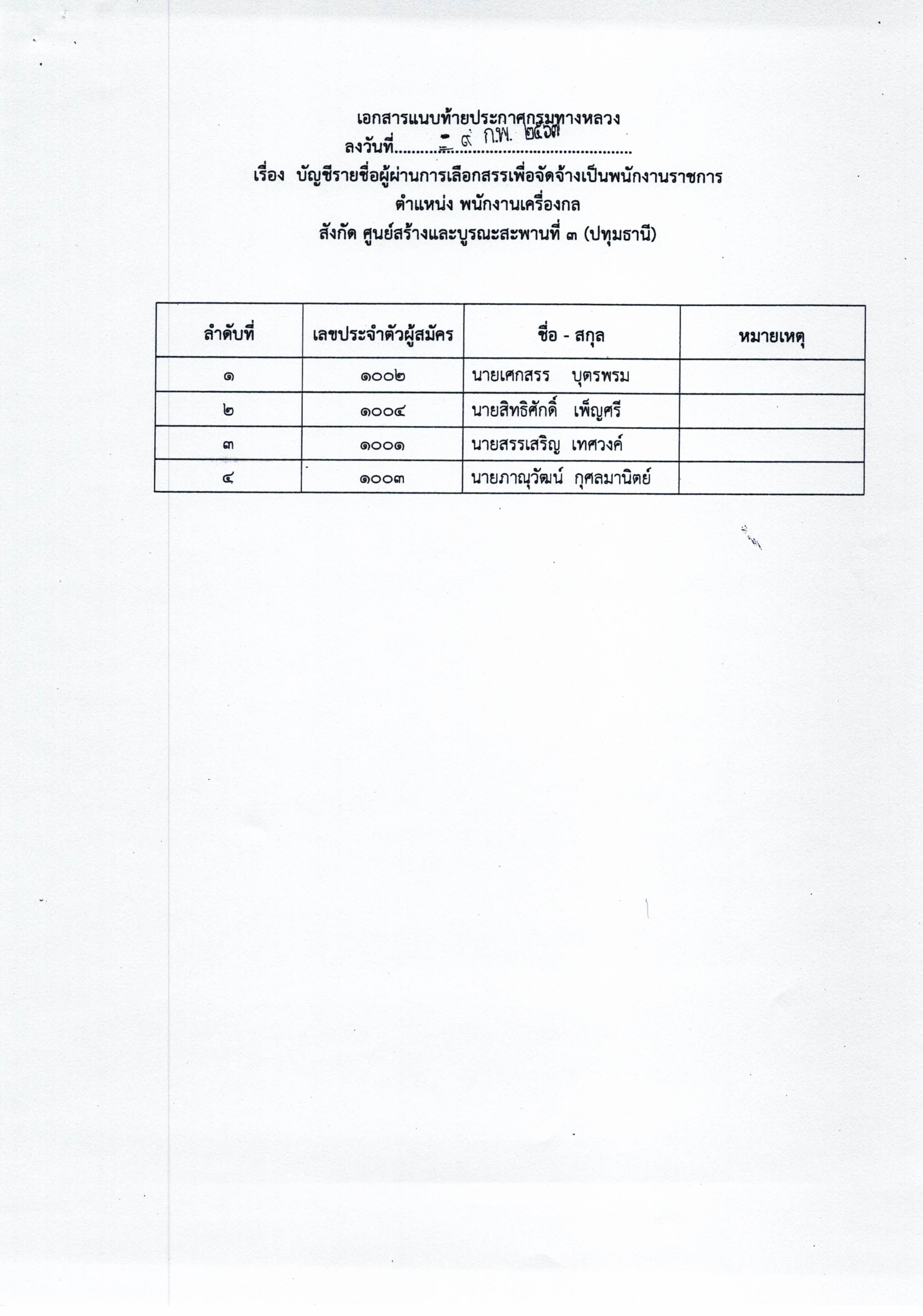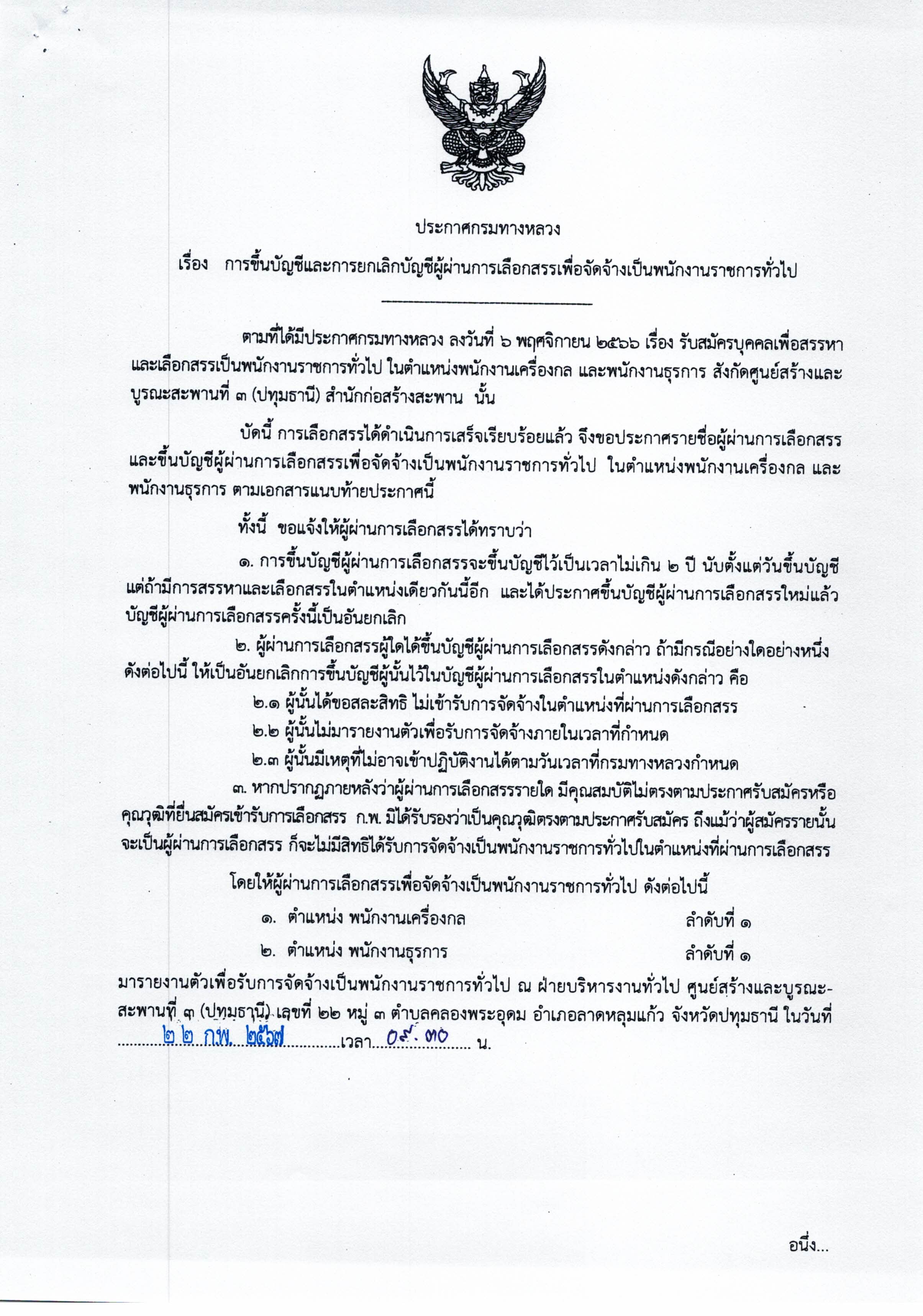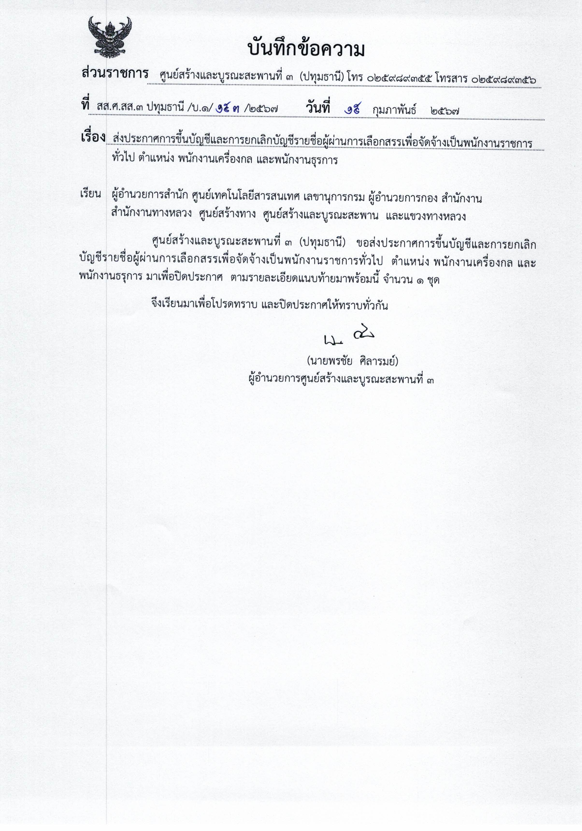ศูนย์สร้างและบูรณะสะพานที่3(ปทุมธานี) ขอส่งประกาศขึ้นบัญชีและยกเลิกบัญชีรายชื่อผู้ผ่านการเลือกสรรเพื่อจัดจ้างเป็นพนักงานราชการทั่วไป ตำแหน่งพนักงานเครื่องกล และพนักงานธุรการ มาเพื่อปิดประกาศ ตามรายละเอียดแนบท้ายมาพร้อมนี้