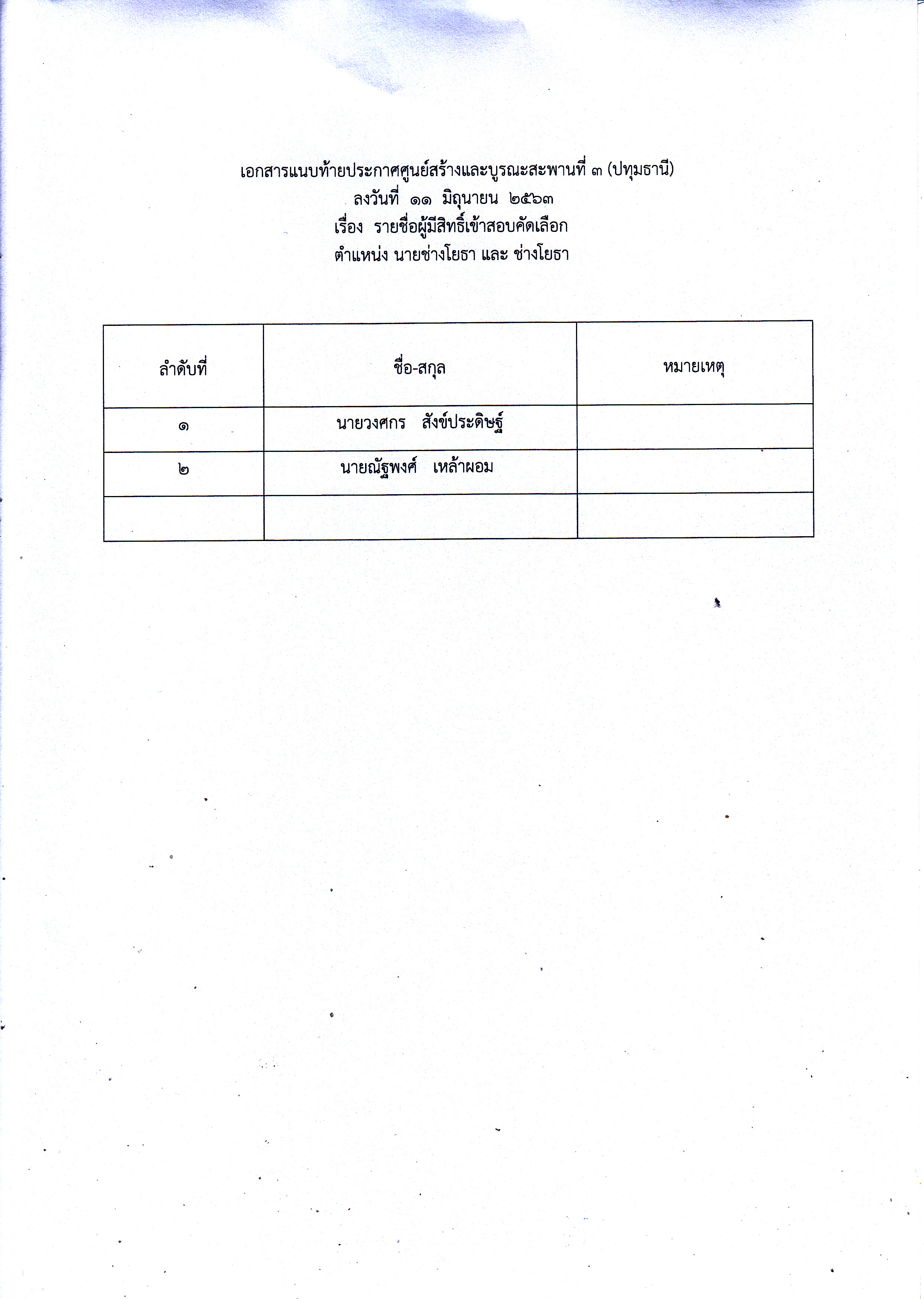 ศูนย์สร้างและบูรณะสะพานที่ 3 (ปทุมธานี )ประกาศรายชื่อผู้มีสิทธเข้ารับการสอบคัดเลือกเป็นลูกจ้างชั่วคราวในตำแหน่ง นายช่างโยธา, ช่างโยธา พร้อมแจ้งกำหนดวัน เวลา สถานที่ในการสอบคัดเลือก ดังเอกสารแนบ