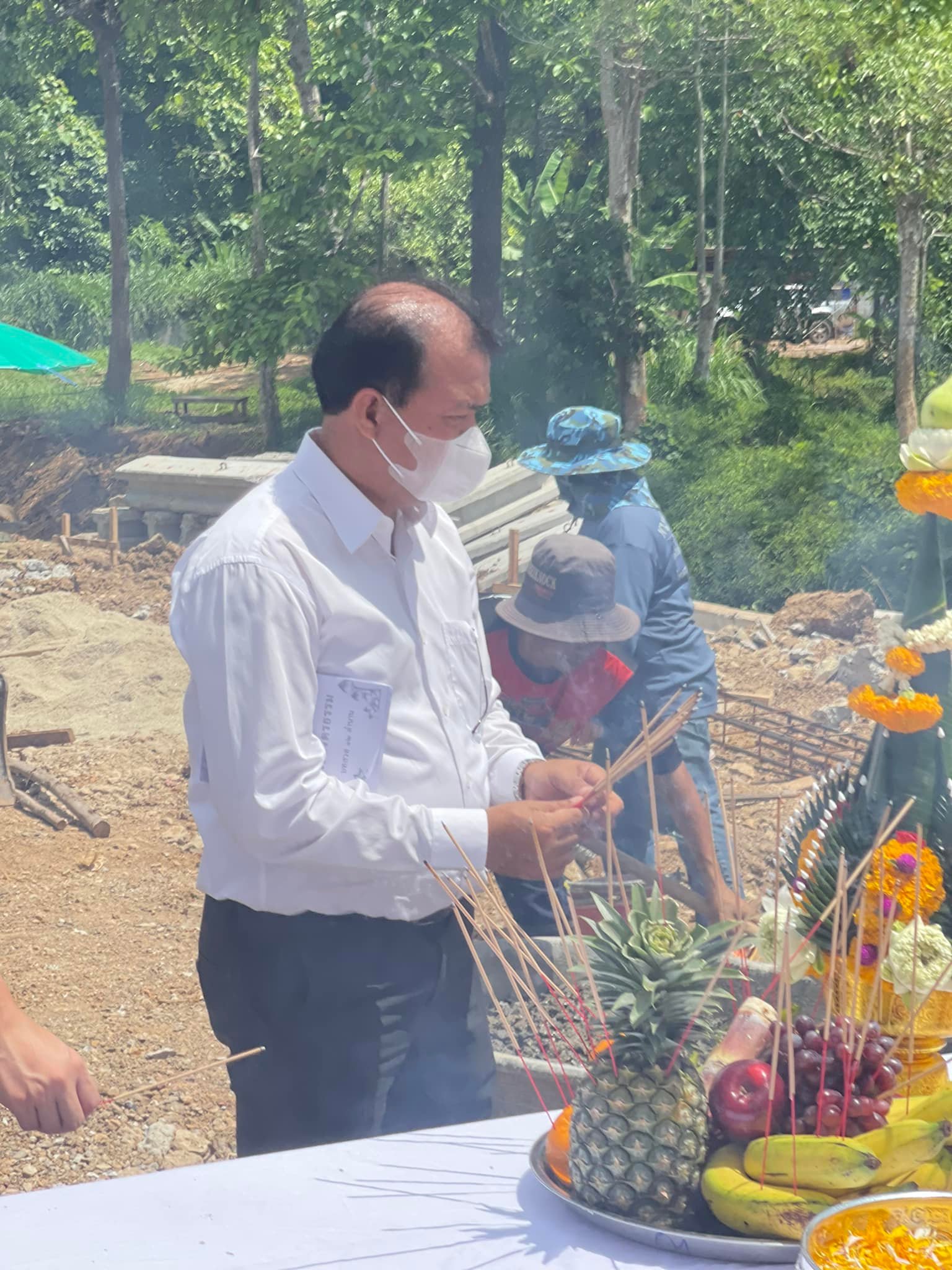 นายธานินทร์ นิยมสินธุ์ ผู้อำนวยการศูนย์ฯ พร้อมด้วยข้าราชการและเจ้าหน้าที่ของศูนย์ฯ ร่วมพิธีวางศิลาฤกษ์เสาเอกอาคารแฟลตที่พัก ณ ศูนย์สร้างและบูรณะสะพานที่ 4