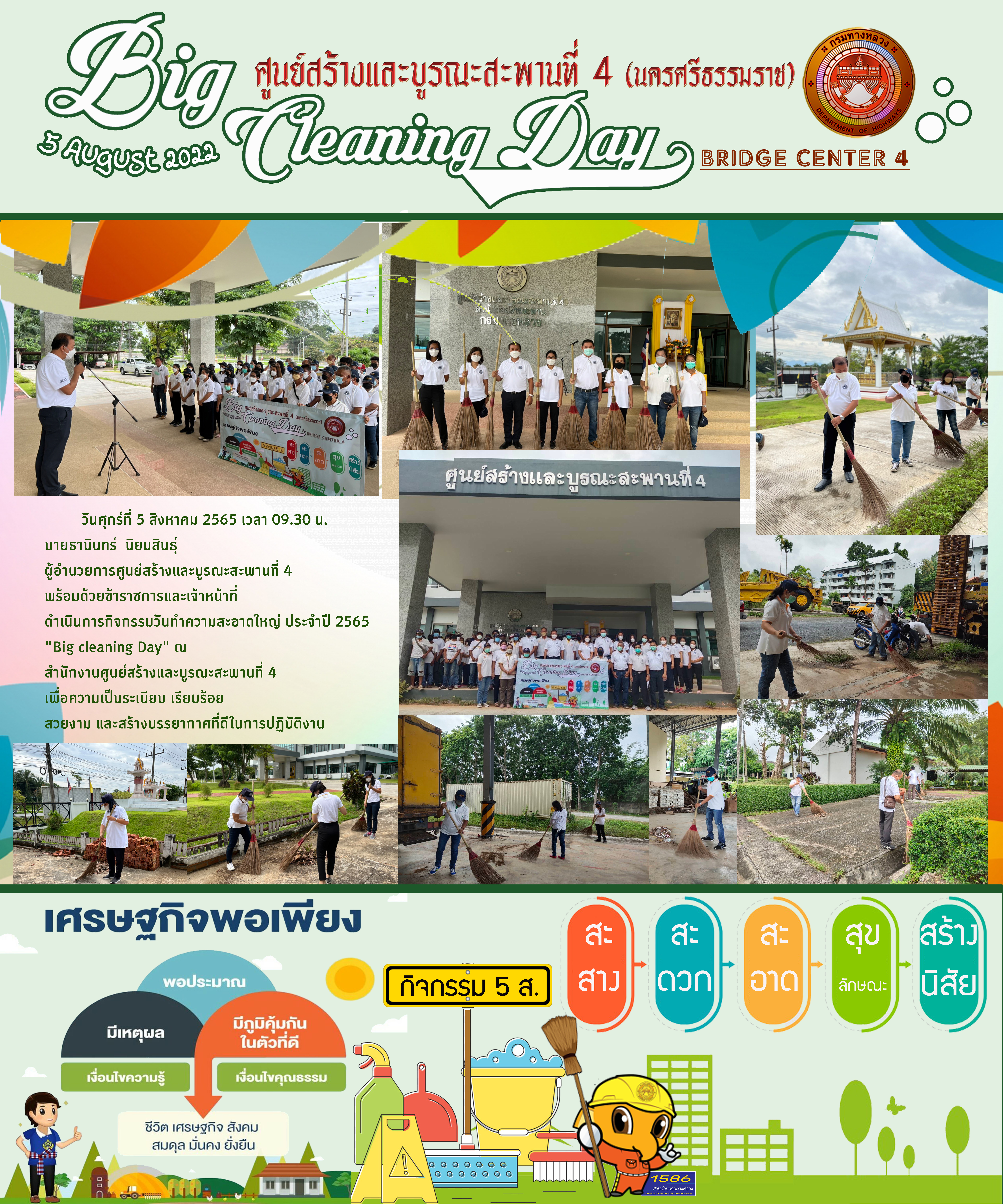 วันศุกร์ที่ 5 สิงหาคม 2565 เวลา 09.30 น. นายธานินทร์ นิยมสินธุ์ ผู้อำนวยการศูนย์สร้างและบูรณะสะพานที่ 4 พร้อมด้วยข้าราชการและเจ้าหน้าที่ ดำเนินการกิจกรรมวันทำความสะอาดใหญ่ ประจำปี 2565 "Big cleaning Day" ณ สำนักงานศูนย์สร้างและบูรณะสะพานที่ 4 เพื่อความเป็นระเบียบ เรียบร้อย สวยงาม และสร้างบรรยากาศที่ดีในการปฏิบัติงาน